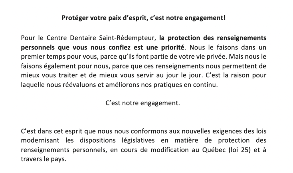 Pour toutes questions, préoccupations ou plaintes concernant la protection de vos renseignements au Centre Dentaire Saint-Rédempteur, n’hésitez pas à contacter notre responsable des renseignements personnels.